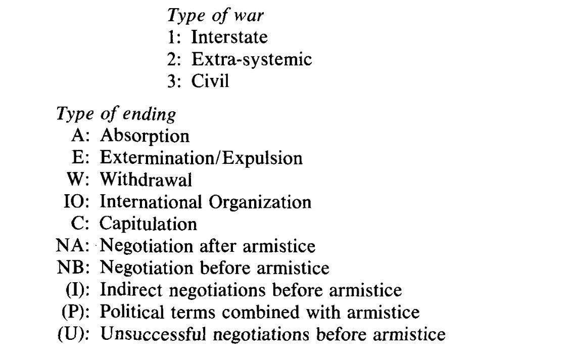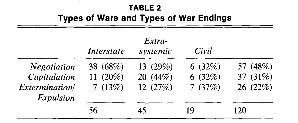 Ce ne spune literatura? Figura de mai jos este extrasă dintr-un studiu al 142 de conflicte militare între 1800 și 1980. Totalurile din partea de jos a tabelului arată că o majoritate substanțială a războaielor s-au încheiat cu un acord explicit între cele două părți. În cele mai multe dintre cele care nu s-au încheiat astfel, una dintre părți a fost exterminată sau expulzată. Atâta timp cât ambii beligeranți există, cu alte cuvinte, este rar ca luptele să se încheie fără un acord scris. Este poate chiar mai rar decât indică totalul de șapte retrageri, deoarece cinci dintre aceste șapte sunt cazuri discutabile sau speciale.