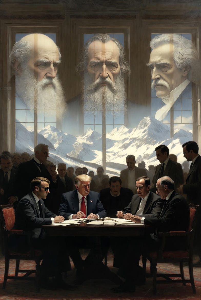 Discursul său a fost însă un amestec obișnuit de idei frânte, sloganuri din campanie, dar a conținut și a treia viziune asupra relațiilor internaționale, cea paternalistă/wagneriană/practică. Statele Unite, de pe tronul lor aflat deasupra umanității, își ceartă aliații, aflați la un nivel inferior al puterii, dar trebuie de asemenea să-și urmeze propria strategie a Marii Puteri. Preocupările ei sunt altele, discursul este altul. Zeii sunt geloși și nemiloși când muritorii nu le arată recunoștință, spunea Calypso, iar reproșul adus de Trump arată cum aliații europeni au beneficiat atâta timp de suportul și umbrela americană, protecția armată și iată acum câtă lipsă de recunoștință; el nu cere mare lucru, decât o „bucată de gheață”, pe care o numește pe rând Islanda și Groenlanda, dar nici pe asta nu o primește, subliniind, spre ușurarea multora, că nu va utiliza forța împotriva Danemarcei. E ciudat că după secole, tot Danemarca, acest regat în care „ceva era putred”, apare iar în centrul acestui simulacru de tragedie.